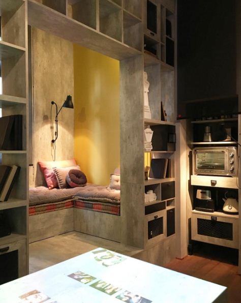 En el espacio 9, denominado “Monoambiente de una estudiante”, la arquitecta María Zuker explicó que el lugar fue pensado para que pueda habitarlo una estudiante de arquitectura: “Fue un desafío muy grande porque había que crear en 14 metros cuadrados algo cómodo y que pueda cumplir con todas las actividades propias de un arquitecto. Aprovechamos la altura del espacio y cambiamos el paradigma: hicimos que los muebles se pongan en función del espacio y generamos una biblioteca que, a la vez, es escalera y conecta los dos mundos: el de la actividad que está abajo, y el del descanso en la parte superior”.