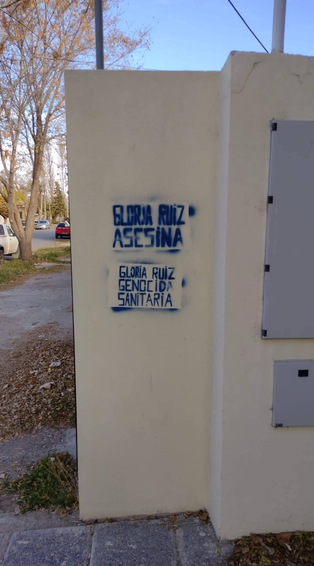 El Municipio de Plottier compartió en sus redes sociales fotos de las pintadas que aparecieron acusando a la intendenta Gloria Ruiz de «asesina y genocida». Aseguran que se trata de una campaña en su contra por no acatar las restricciones que decretó el Gobierno provincial y permitir un horario de circulación más amplio. Sin embargo, no mencionaron a ninguna persona o grupo como culpable.