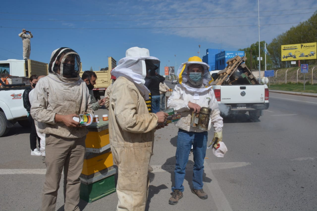 Los apicultores estuvieron al costado de la ruta, donde realizaron una interrupción sobre la calzada pero permitieron circular. También entregaron panfletos y un pequeño envase de miel a quienes pasaban por el puente. Las personas que llevaron adelante su reclamo asistieron con sus trajes de apicultores y con sus ahumadores, elementos usados en su labor diaria.