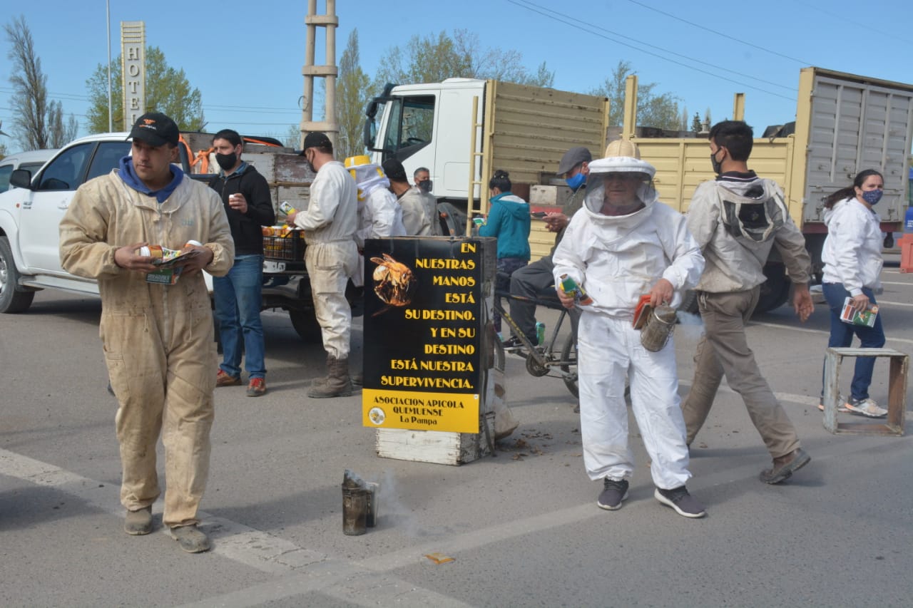 Realizaron una panfleteada y regalaron miel a los que circulaban por la vía que une ambas provincias Pidieron libre tránsito de colmenas y marcha atrás de cobro de cánones interprovinciales, entre otros puntos. También hubo reclamos en otras rutas del país.
