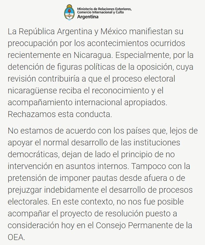 La Cancillería argentina emitió un comunicado en conjunto con su par de México para explicar su posicionamiento. Por un lado, manifestaron «su preocupación por los acontecimientos ocurridos recientemente en Nicaragua. Especialmente, por la detención de figuras políticas de la oposición».