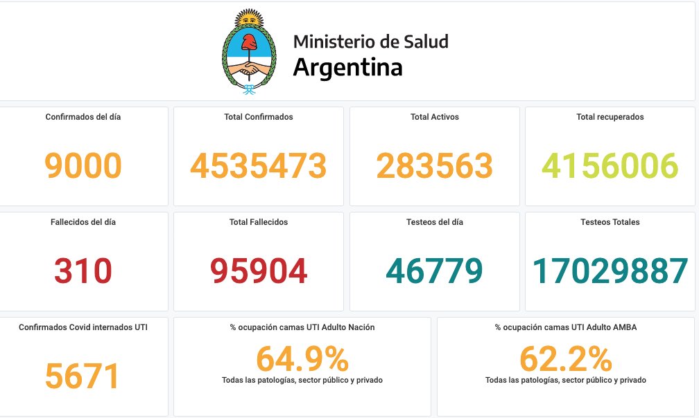 Otras 310 personas murieron y 9.000 fueron reportadas con coronavirus en las últimas 24 horas en la Argentina, con lo que suman 95.904 los fallecidos registrados oficialmente a nivel nacional y 4.535.473 los contagiados desde el inicio de la pandemia, informó hoy el Ministerio de Salud.