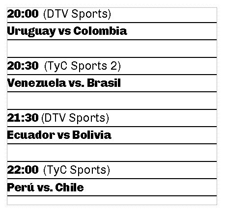 La jornada se cerrará a las 22 en Lima donde Perú (8) recibirá a Chile (7), en un clásico del Pacífico que puede definir quién de los dos es el que sigue en carrera.