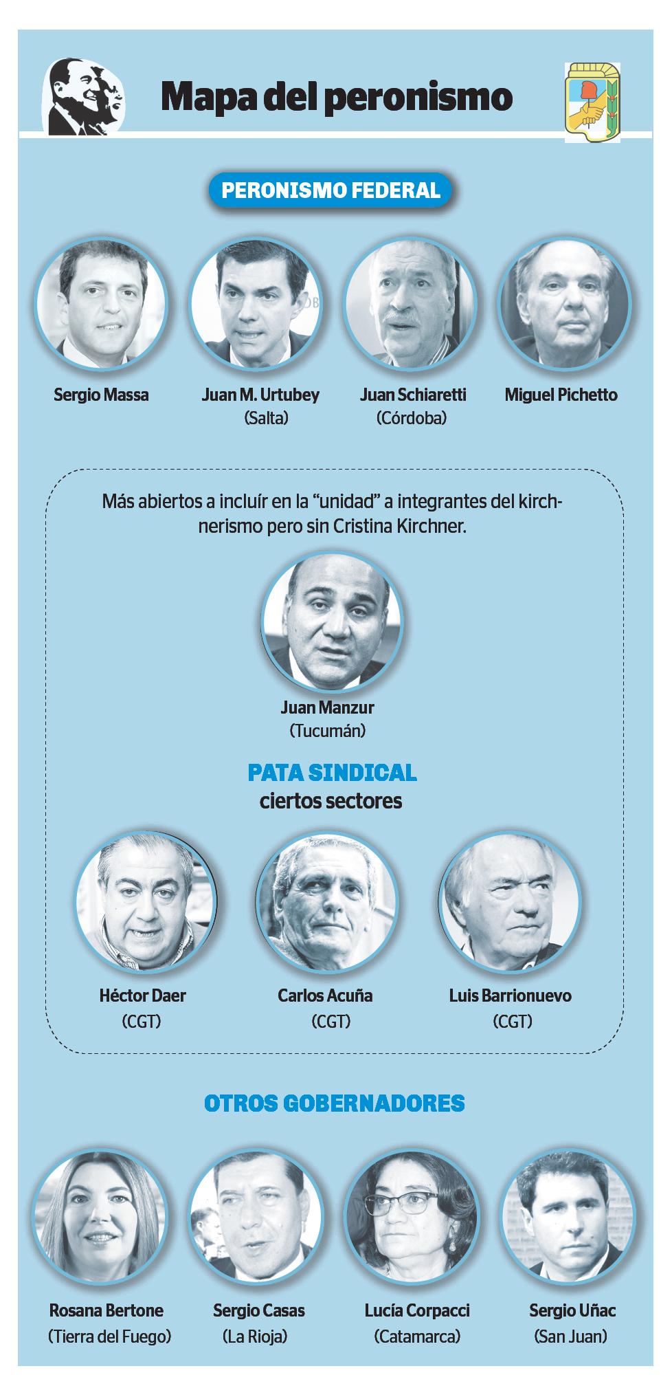 “Es unidad sin el kirchnerismo, o sin los actores centrales. Hay diferencias en el peronismo federal, pero en última instancia es unidad sin Cristina”, dicen cerca de Urtubey. “Con la pata K no hay ninguna intención de unirse”, aseguran hoy cerca de Massa. “Es unidad del peronismo, y Unidad Ciudadana no es parte del peronismo”, repiten cerca de Pichetto. Para el kirchnerismo, por otro lado, unidad es unidad de toda la oposición.