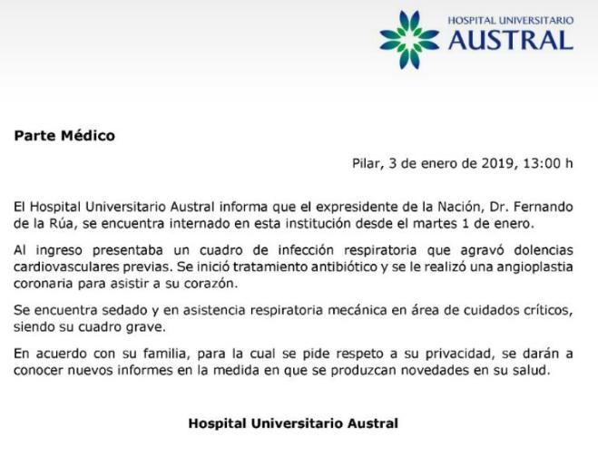 El expresidente Fernando de la Rúa permanece internado en el Hospital Universitario Austral en estado “grave”, sedado y con asistencia respiratoria mecánica, luego de que se agravaran sus dolencias cardiovasculares por una infección respiratoria.