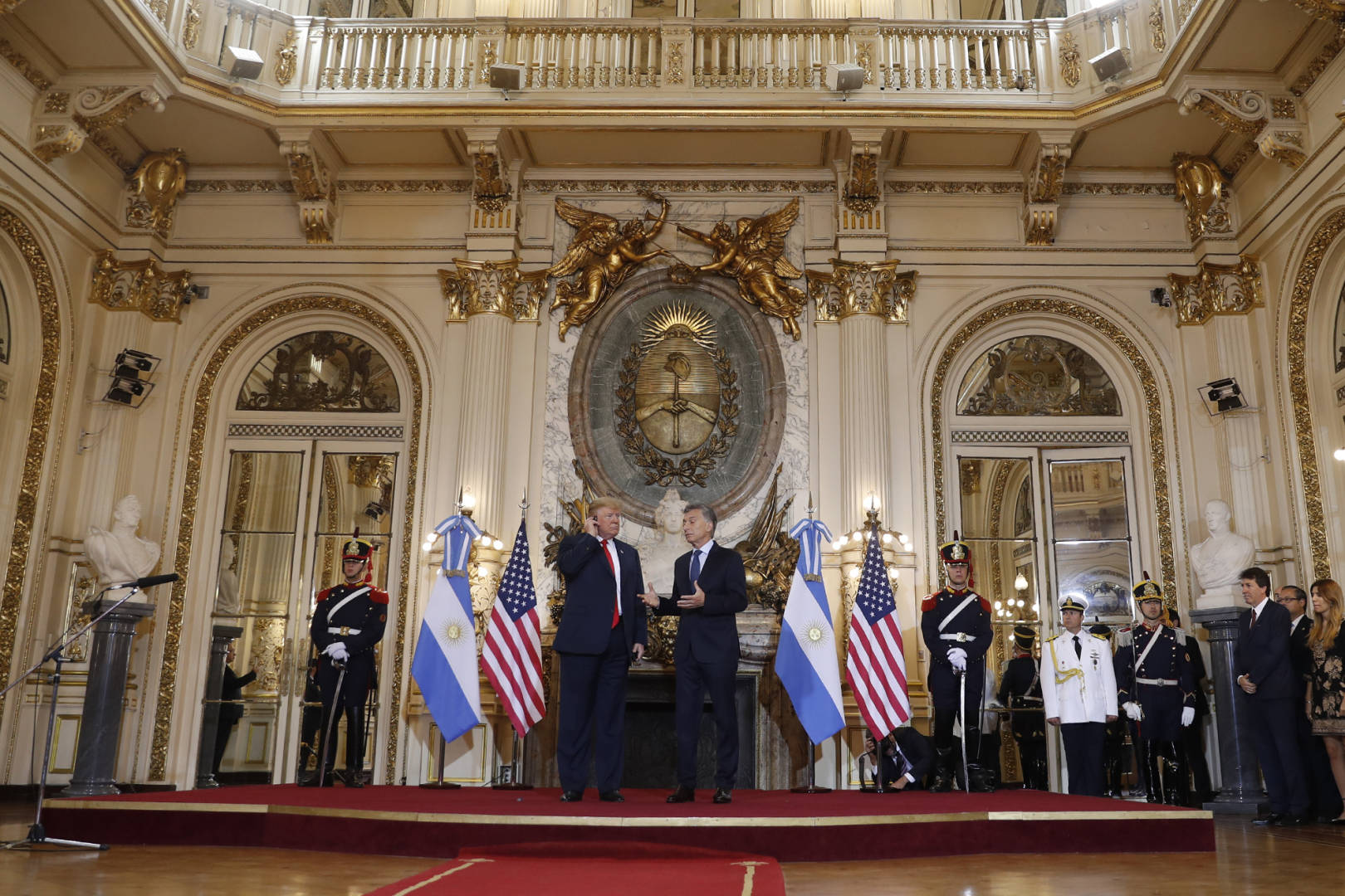 “Es un honor estar aquí con ustedes amigo mío. Gran familia, excelente trabajo, felicitaciones para ti”, subrayó el mandatario norteamericano. Antes de compartir un desayuno en el Salón de los Científicos de la Casa Rosada, Macri le recordó a Trump la importancia de las inversiones estadounidenses en la Argentina. “Quiero contarte que los inversores más importantes en la Argentina son las empresas americanas. De donde más han crecido los visitantes es de los Estados Unidos, y es demostración del interés del pueblo norteamericano por la Argentina”, indicó Macri. “Seguramente en la reunión que ahora vamos a mantener encontraremos muchas formas de superarnos en beneficio de nuestra gente”, añadió.