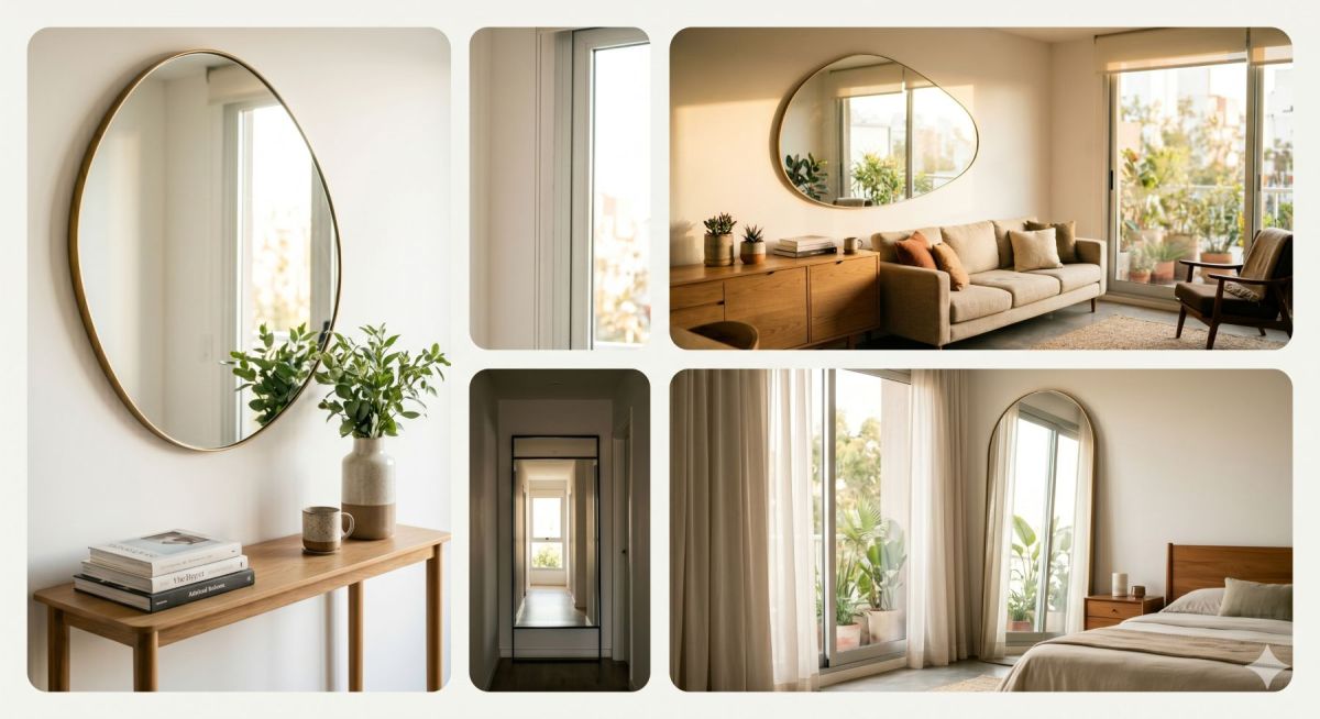 - Efecto Ventana: ubicar un espejo frente a una abertura duplica visualmente el ingreso de luz natural, ideal para departamentos internos o casas con ventanales chicos.