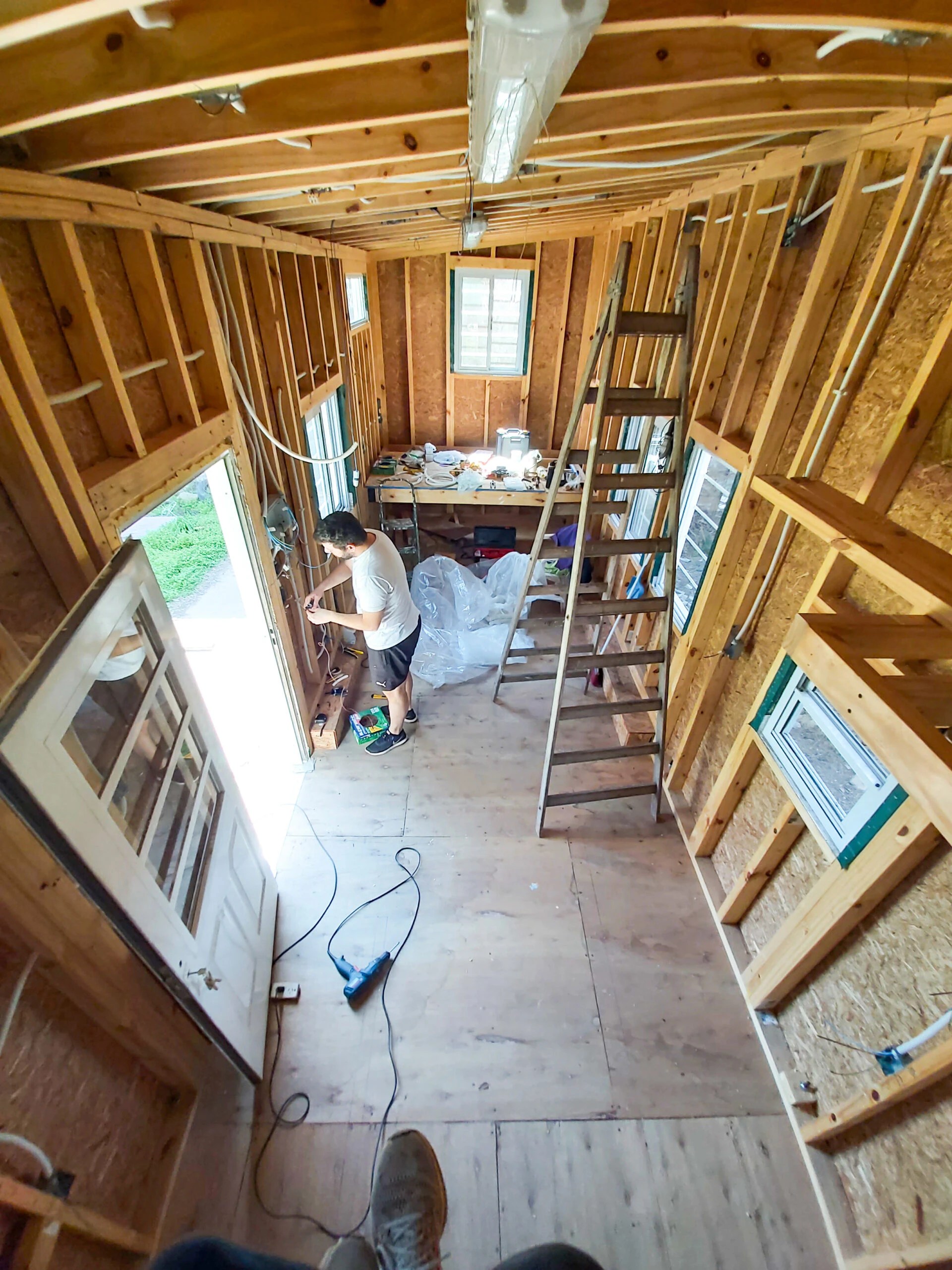 La tiny está construida con el sistema wood frame, en madera. Nuestros “cimientos” son el tráiler. Las estructuras de las paredes están hechas con tirantes de pino de 2×4 y, para el techo, usamos vigas de pino de 2×6. A toda la estructura la rigidizamos con placas OSB y la aislamos con poliestireno expandido.