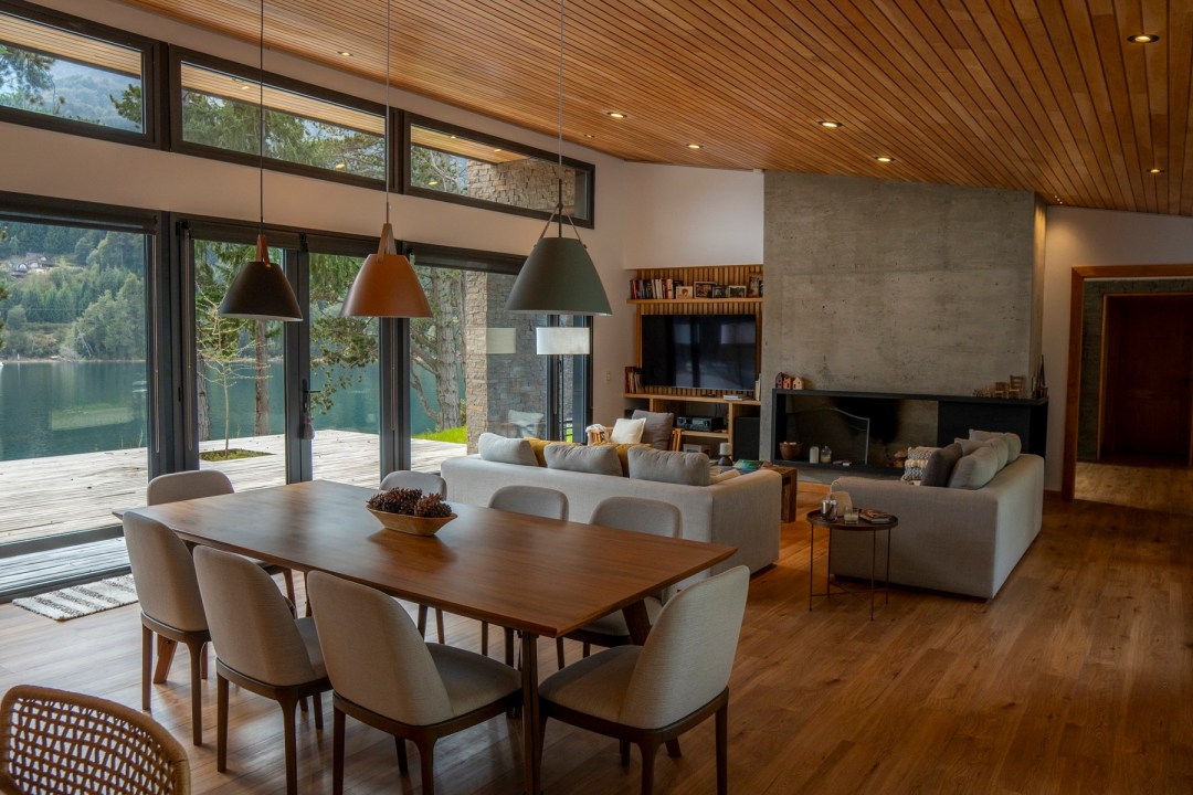 En el interior, los cielorrasos de lenga prolongan la calidez de la madera hacia cada ambiente y, al mismo tiempo, generan continuidad visual y apertura hacia el norte, enmarcando la montaña como parte esencial de la vida cotidiana dentro de la casa.