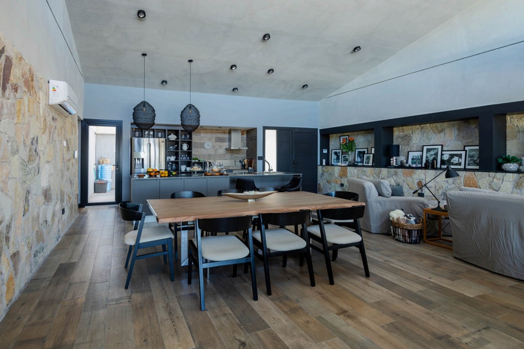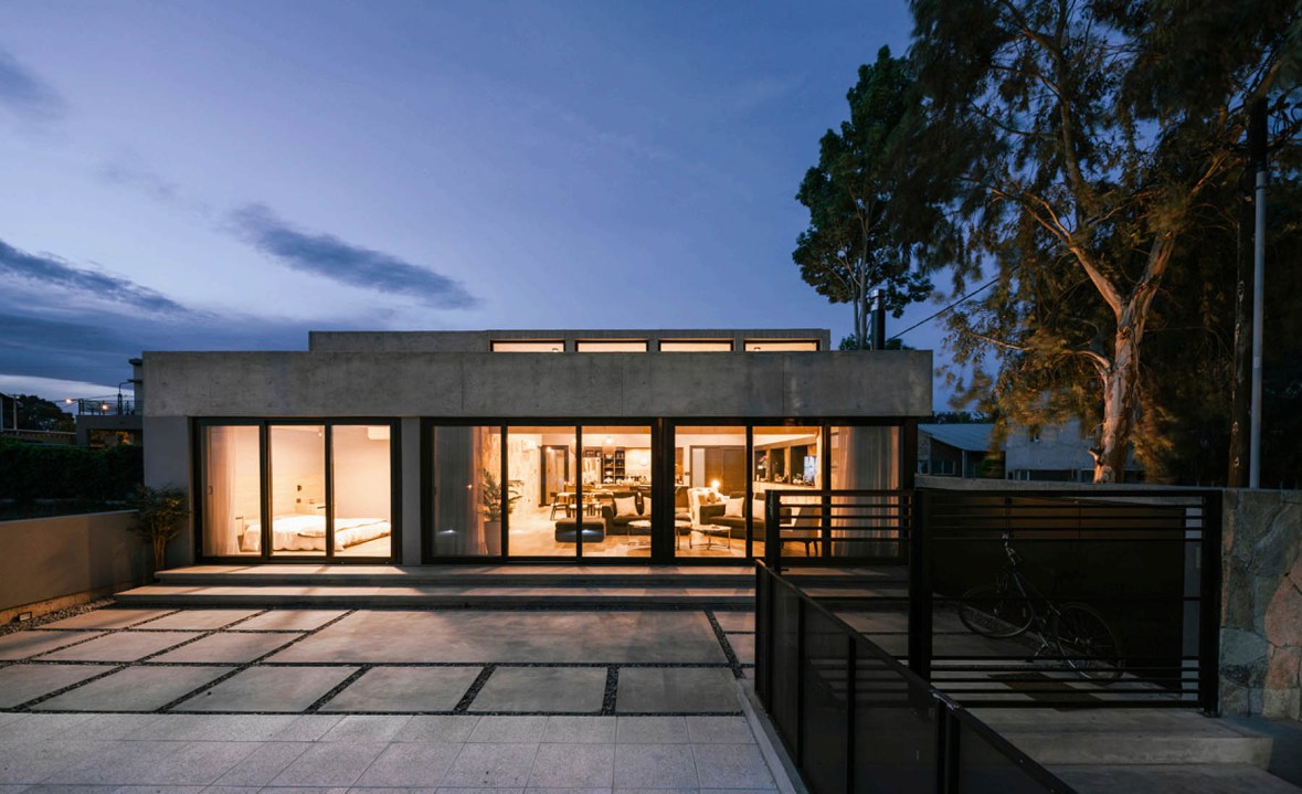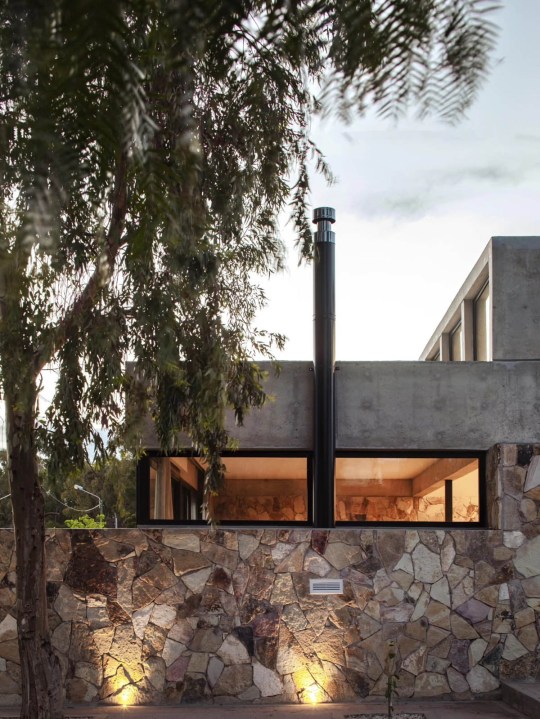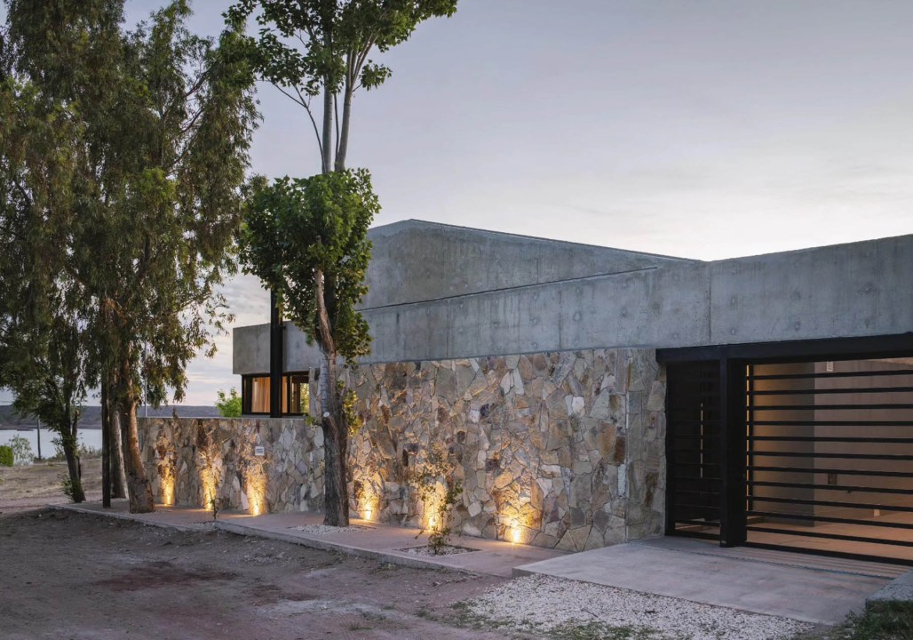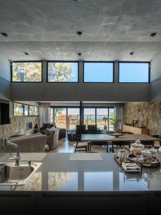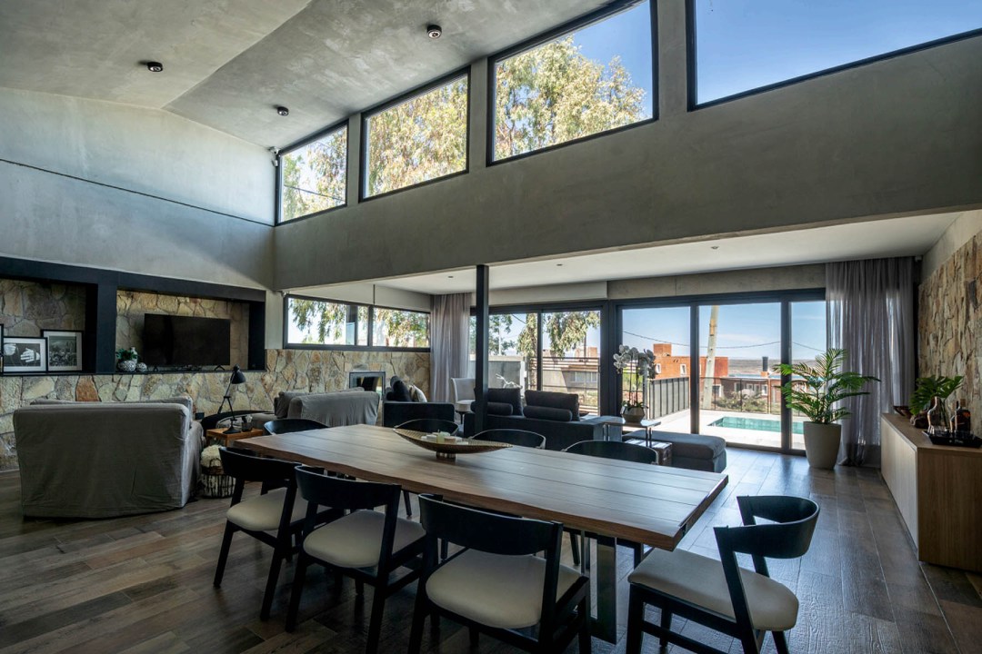 Las carpinterías son de piso a techo, con paños fijos y corredizos. La materialidad exterior e interior combina hormigón visto, piedra natural y metal.