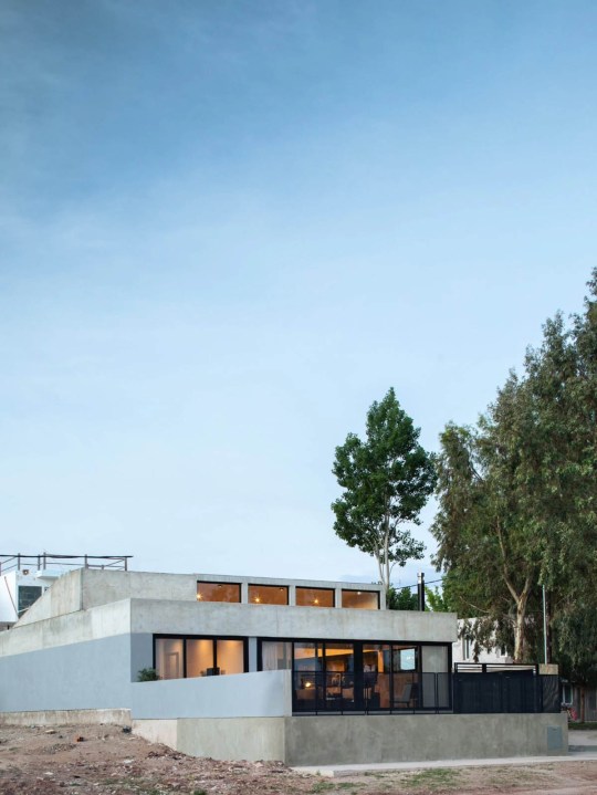 La implantación responde a la topografía del terreno: resolvieron el desafío de los desniveles mediante plataformas y muros de contención.