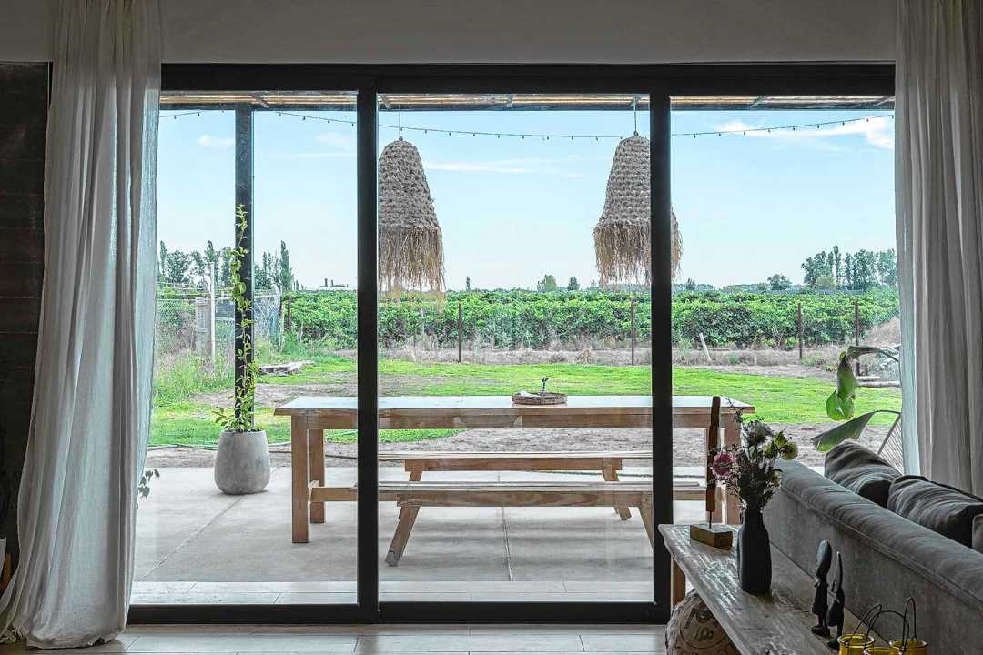 Esta vivienda construida en el entorno rural mendocino se estructura en base a dos tabiques que se introducen en el espacio interior, lo dividen en tres espacios y lo conectan con el exterior.