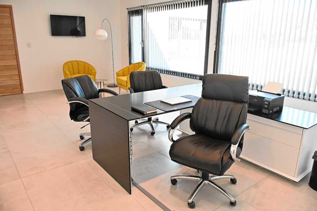 Con espacios confortables para quienes trabajan allí y para los que la visitan: un patio interno para respirar aire libre, una cocina para tomar o comer algo al lado de un ventanal, una sala de recepción también de buen porte como anticipo de lo que sigue. Para que los clientes (requirentes en la jerga) se sientan a gusto desde el principio: desde el detalle del diario sobre la mesa a los pisos, la madera, las luminarias, el mobiliario, la amplitud. Por todo eso, sólida pero funcional, sin rastros de la rigidez solemne que el imaginario colectivo asocia con su profesión.