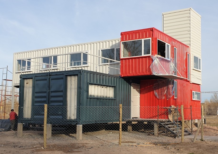 En un galpón alquilado en Plottier, luego de la pandemia empezaron a llegar los containers y ahí los cortaban, se soldaban aberturas, escaleras, uniones en techos a medida que arribaban desde Buenos Aires y vaya a saber de qué mares. Elegían sacrificar las caras más oxidadas o abolladas en las zonas donde se unía un módulo con otro.