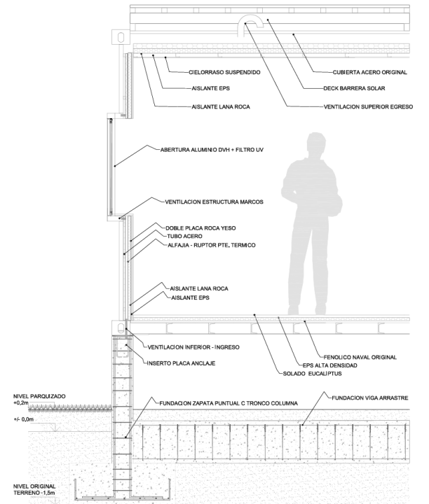 “Al final, usamos un aislante para el frio, otro para el calor, ruptores de puente térmico, cámaras de aire ventiladas por convección con entradas bajo los zócalos y salidas en los cielorrasos, y cubrimos todos los techos con decks de madera, en todos los casos con los materiales de costo más bajo posible y la paciencia eterna de los constructores”, explica Federico.