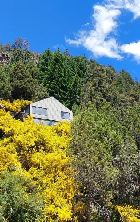 En la ladera de un cerro de San Martín de los Andes, entre el amarillo de las retamas y el verde de los pinos brilla con luz propia una casa de 220 metros cuadrados integrada al paisaje atrapante de la cordillera neuquina, de cara al mallín y la ciudad. La habita una pareja que quería volver desde Buenos Aires a la provincia con sus dos pequeños hijos, con el plan familiar de instalarse en la montaña.