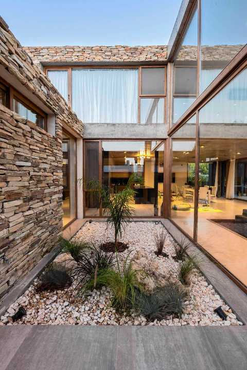 La casa se ordena a través de un eje principal que es el patio interno, que divide los espacios y visualmente los conecta al mismo tiempo, rodeado de plantas patagónicas y un diseño agreste.