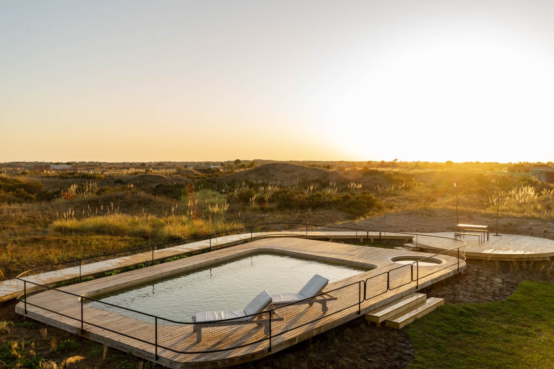 La pileta, jacuzzi y solárium repiten las formas orgánicas de los vacíos en las losas, generando un diálogo constante entre interior y exterior.