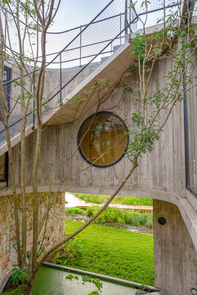 Sus formas orgánicas y transparencias generan una vinculación visual entre los sectores sociales, ayudando también al ingreso de luz en la zona de juegos de los niños, que se cierra hacia el frente de la casa orientada al sur.