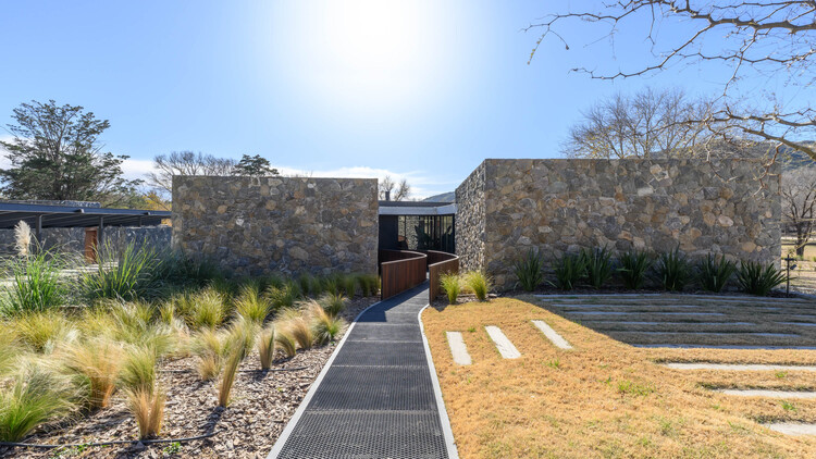 Un puente es el eje de este proyecto en el valle de Calamuchita en el que predominan elementos nobles y rústicos como la madera, el hormigón visto y el hierro para garantizar resistencia al paso del tiempo y al entorno natural y al mismo tiempo darle una estética sólida y atemporal.