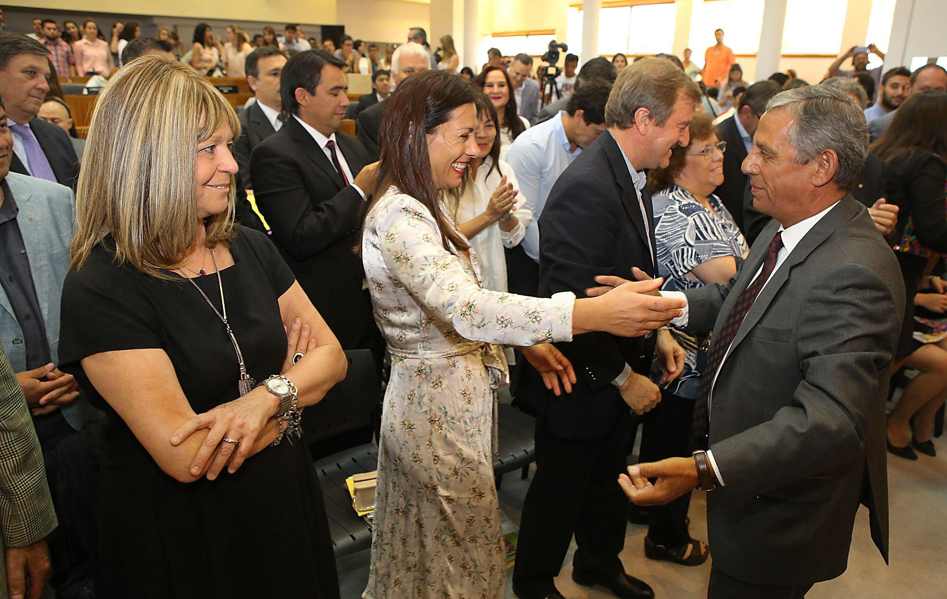 La ministra Storioni y la senadora Crexell saludando al intendente Quiroga.
