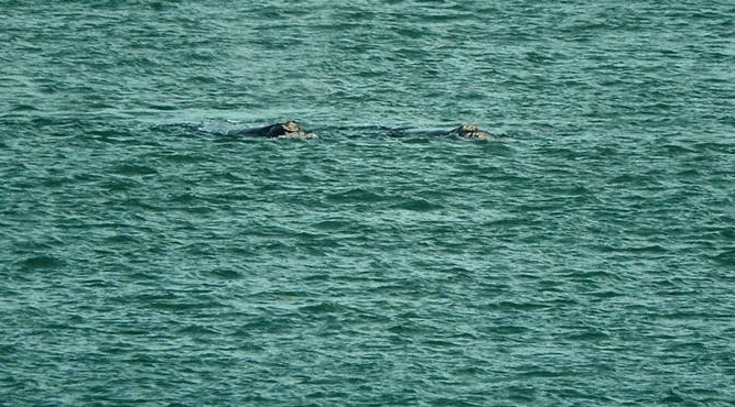 Las imágenes fueron capturadas por la guarda ambiental de Punta Bermeja, Antonella Lema, quien las compartió la semana pasada y dejó registrado el momento en que los dos ejemplares de ballena franca austral pasaron frente a la costa de la Lobería.