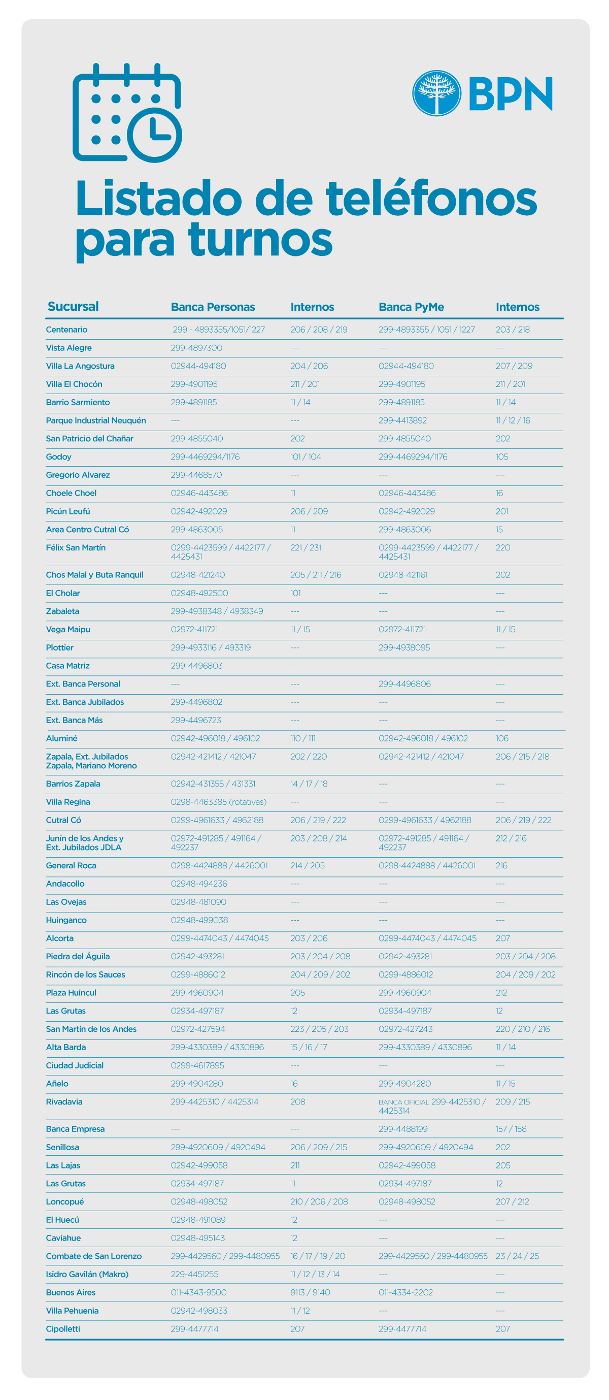 -Banco Provincia de Neuquén (BPN): podrán solicitar turnos a la casilla de email turnos@bpn.com.ar o telefónicamente, de 8 a 15, a los números habilitados con dicho fin en cada sucursal. A partir del sábado, solo podrán solicitarse desde el sitio web www.bpn.com.ar. Los trámites relacionados con depósitos y pagos se podrán gestionar únicamente a través de cajeros electrónicos, terminales de autoservicio, homebanking u otros canales que se encuentren disponibles.