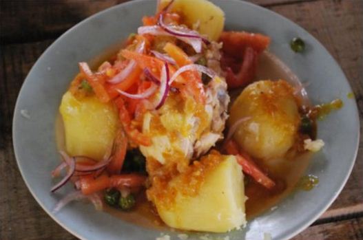 – En un plato acomodar 2 o 3 papas, luego poner la presa de pollo encima y por último la preparación de ají y cebolla sobre el pollo.