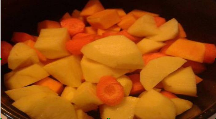 Pelar y picar las verduras y hervir hasta que estén blandas.