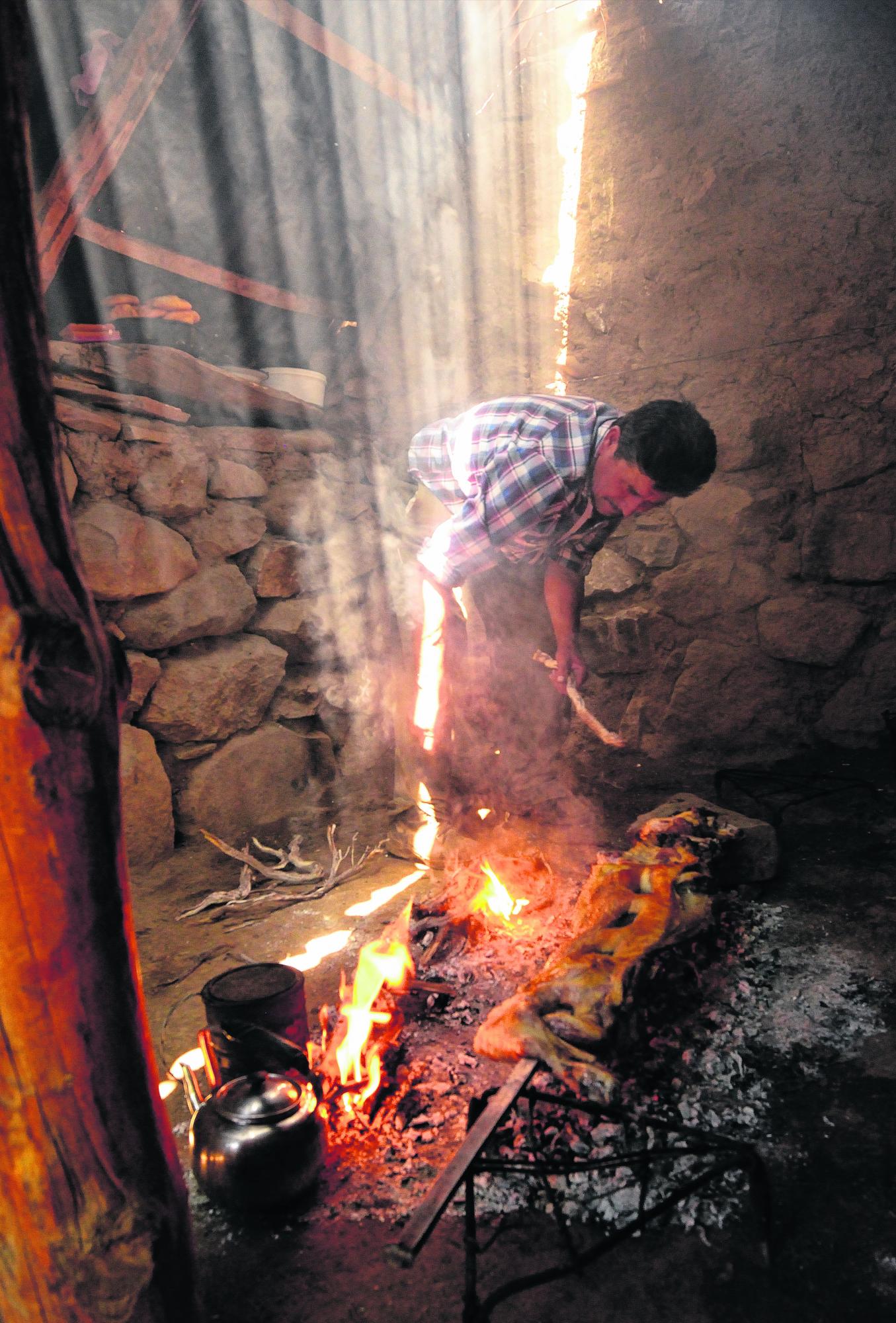 Unos 20 km hacia el norte, sobre una lomita en un valle rodeado de montañas a dos mil metros de altura, don Valentín Guerrero (67) cocina un chivo recién carneado. Mientras el cuero se orea colgado de una cuerda, esparce las brasas con calma, en silencio, bajo el techo de chapa del puesto de piedras y barro. Afuera, Dora (59), madre de sus 12 hijos (nueve mujeres y tres varones) pone sobre la mesita de madera las tortas fritas que cocinó minutos antes y prepara la ensalada de lechuga que trajeron los yernos.
