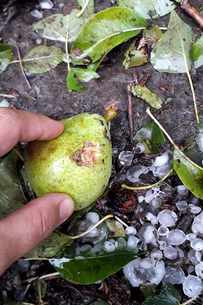 Piedras de granizo de gran tamaño cayeron en la tarde de ayer en Villa Regina afectando parte de la zona productiva de la localidad, a pocos días del inicio de la cosecha de pera William’s en la región.