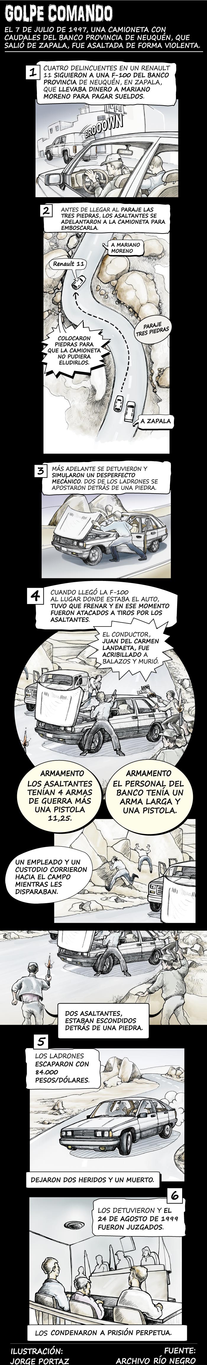 Con este hecho como disparador, repasamos el especial que armó «Río Negro» en 2017, al cumplirse 20 años del suceso. En aquella oportunidad, se realizó una reconstrucción del golpe en formato historieta.