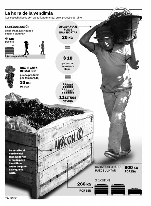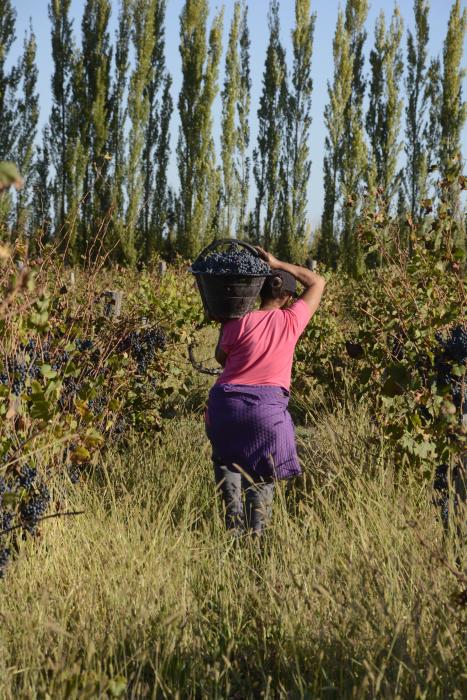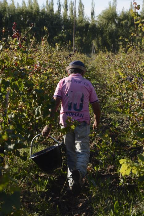 Cuando llega el final de la jornada laboral, que en este caso en particular no tiene establecidos horarios ni de inicio ni de cierre, pero que por lo general se extiende por ocho horas, cada uno de los trabajadores que participaron habrá recorrido alrededor de cuatro kilómetros entre las angostas filas de viñas. La mitad de ese recorrido lo harán cargados con un balde con 20 kilos de uvas, en un terreno mojado por lluvias recientes y el rocío de la mañana.