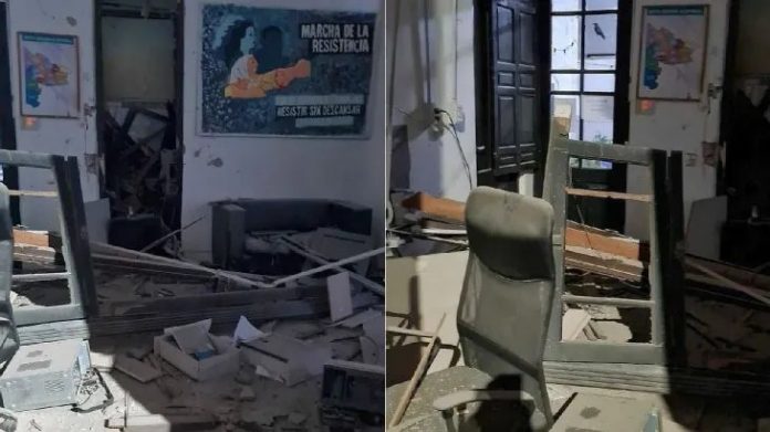 Fuentes policiales informaron que la explosión provocó destrozos en el frente del local partidario y en departamentos cercanos, sin que se registraran heridos.