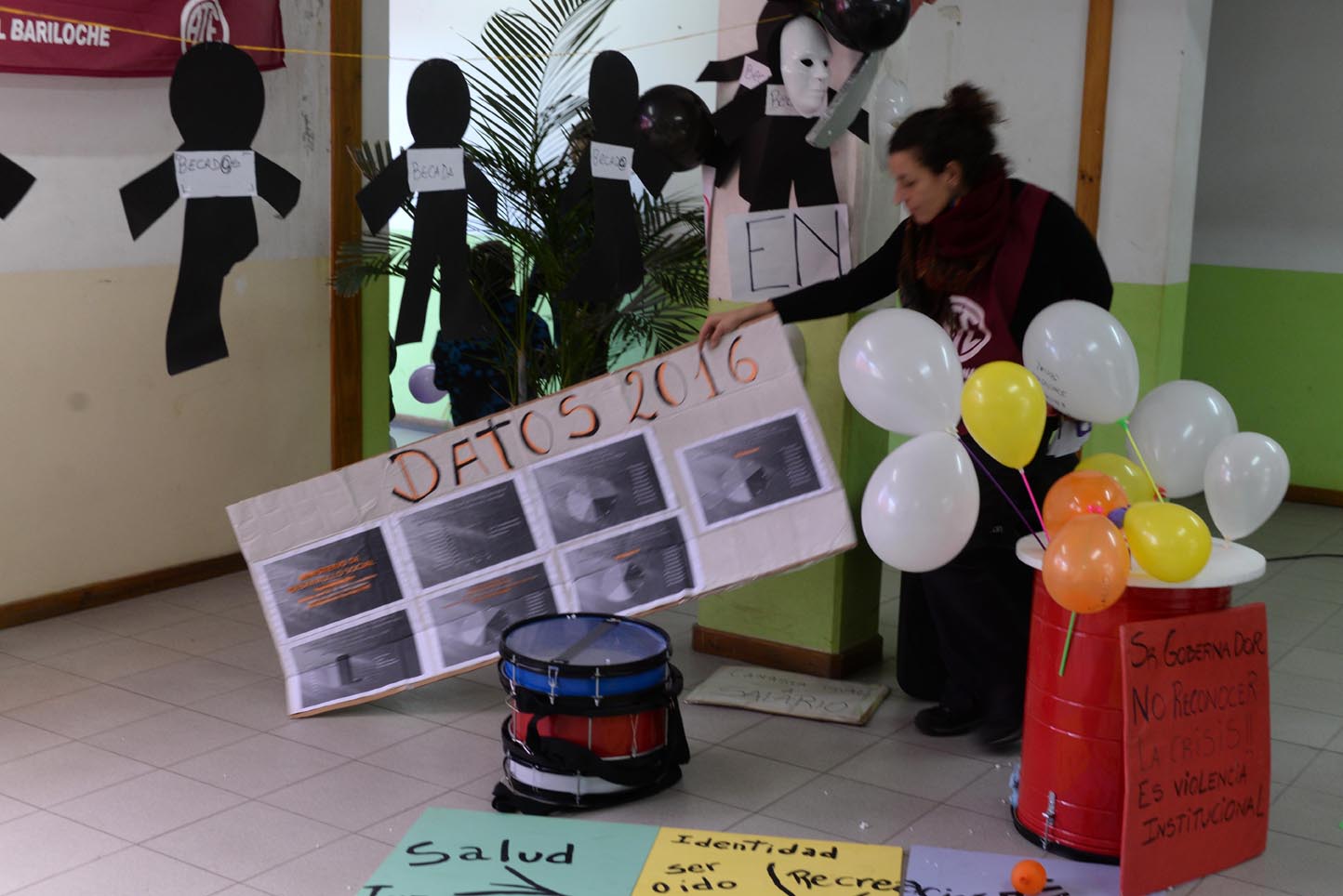 En el hall central del edificio provincial, el gremio colocó carteles con demandas, globos, caretas y tijeras gigantes. Señalan en algunos escritos que “pasan los meses y los acuerdos no se cumplen” o que “los nuevos contratados de Salud tardan 8 meses en pagarles”, también expresan “si el gobernador no reconoce la crisis, es violencia institucional”.