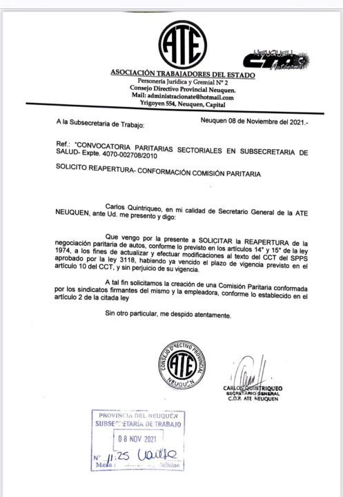 Desde ATE se resaltó que el secretario general, Carlos Quintriqueo, ya había anunciado el pedido de paritaria cuando participó de la comisión de Trabajo el martes pasado. Fue después de que los legisladores votaran el archivo que Siprosapune decidió realizar cinco días de paro a partir de hoy. Con la manifestación de los profesionales en la calle, el gremio de estatales dio a conocer que oficializó la solicitud.