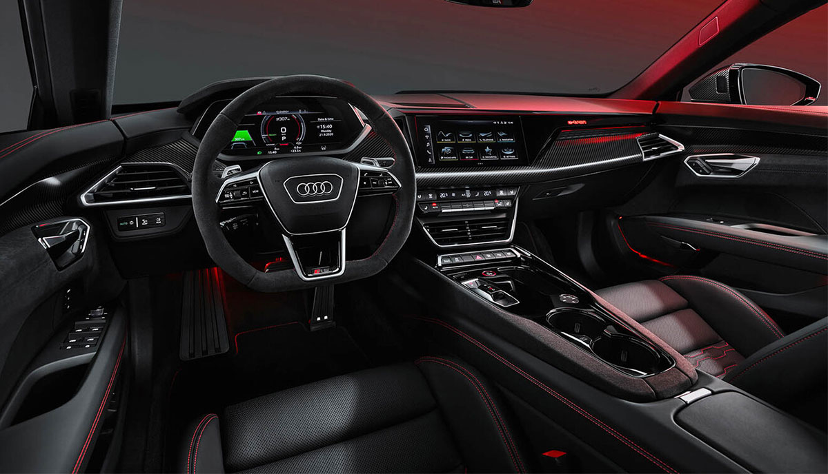 En el interior, el e-tron combina parte del estilo de los nuevos productos de la marca, con un diseño mucho más jugado que la tradicional sobriedad que caracterizaba a Audi, con una impronta más tecnológica. Posee instrumental digital Audi virtual cockpit plus, sistema multimedia con una enorme pantalla de 10,1” integrada al tablero, equipo de sonido Bang & Olufsen más un display adicional para el climatizador. El habitáculo fue diseñado siguiendo el concepto de monoposto, con una posición de manejo inspirada en los vehículos de competición, bien baja. Mientras el Taycan luce una propuesta algo más refinada y minimalista, la berlina de Audi apuesta por la deportividad y agresividad como en su exterior.