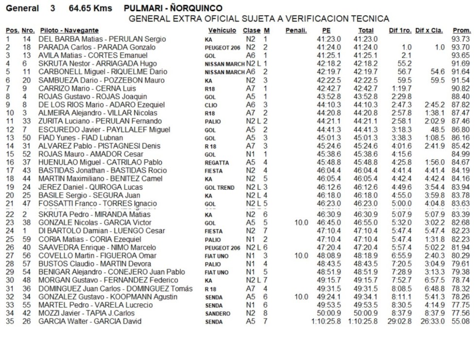 Del Barba está adelante tanto en la general como en el Grupo N-2; Carrizo, en la Clase A-7; Avila, en la A-6; Gustavo Rojas, en la A-5; Skruta, en el Grupo N-2 Light; Mauro Rojas, en el Grupo N-1, y falta que terminen el tramo los participantes de la A-1.