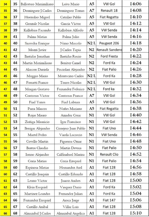 De los 74 anotados, fueron 66 las tripulaciones que sellaron y quedaron habilitadas para participar desde hoy a las 13.33 en el Rally de Aluminé, la primera de las nueve fechas que tendrá el certamen neuquino que una vez más ratificó su gran convocatoria y promete entregar un gran espectáculo por la calidad de muchos de los participantes.