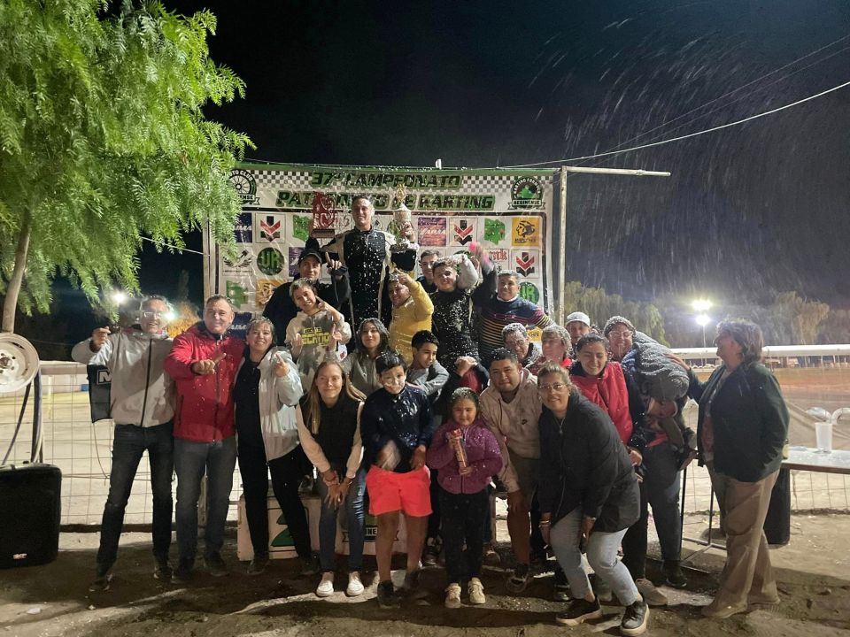 Ezequiel Tassile festejó con su equipo la brillante conquista del título en la categoría 125 cc. del certamen nocturno de verano del Karting Fórmula Reginense. Gentileza.