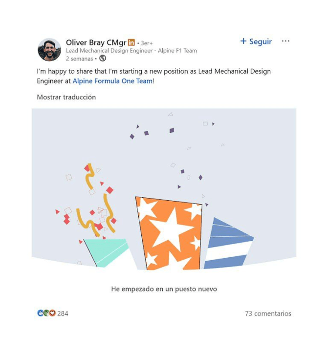 El propio ingeniero compartió la noticia en su perfil de LinkedIn: “Me complace compartir que estoy comenzando un nuevo puesto como Ingeniero Líder de Diseño Mecánico en Alpine”, expresó.