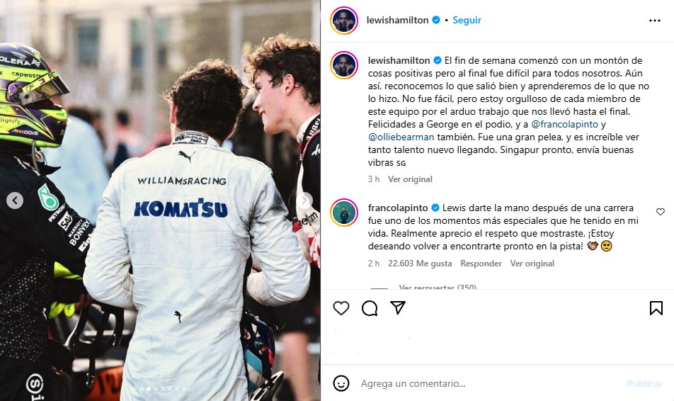 Y Colapinto no tardó en responderle a su posteo, «Lewis, estrechar manos con vos después e una carrera fue uno de los momentos más especiales que tuve en mi vida», destacó el piloto de 21 años. Y remarcó que «realmente aprecio todo el respeto que demostraste. Espero el momento de encontrarnos de nuevo pronto».