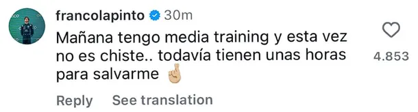 En tono humorístico, la publicación cuestionaba a los seguidores cuál frase del piloto agregarían a la lista. La respuesta de Colapinto no tardó en llegar, con una divertida aclaración: «Mañana tengo media training y esta vez no es chiste… todavía tienen unas horas para salvarme».