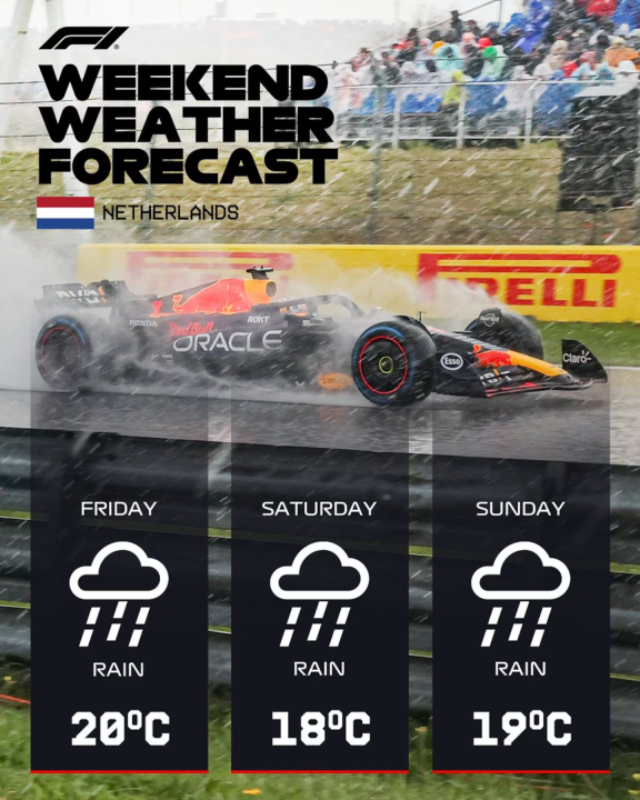De acuerdo al pronóstico para la zona en la que se encuentra emplazado el circuito de Zandvoort, habrá lluvia durante los tres días de competencia. Aunque las temperaturas serán bastante agradables y estarán entre 18 y 19 grados, se espera una pista mojada para las prácticas, la clasificación e incluso la carrera del domingo.