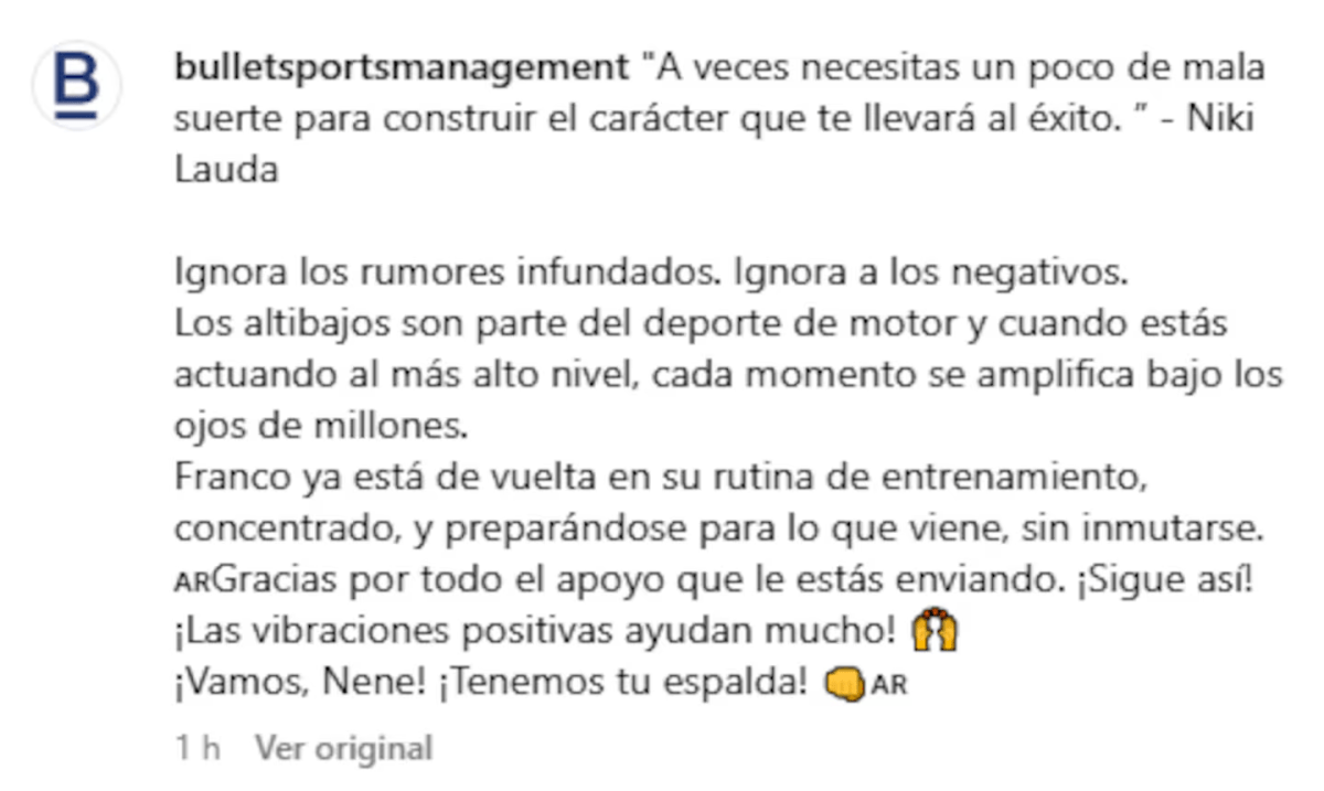 En el posteo, citaron una frase del expiloto Niki Lauda: “A veces necesitas un poco de mala suerte para construir el carácter que te llevará al éxito” – Niki Lauda». Luego, escribieron sentidas palabras para el piloto y para los fanáticos: “Ignora los rumores infundados. Ignora a los negativos. Los altibajos son parte del deporte de motor y cuando estás actuando al más alto nivel, cada momento se amplifica bajo los ojos de millones”.