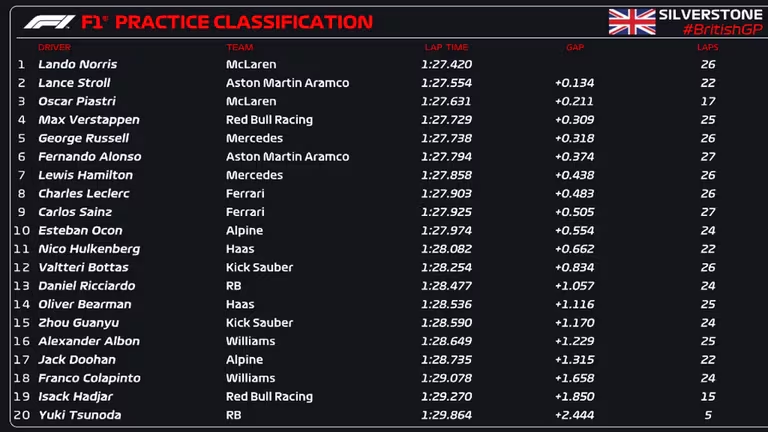 Franco se ubicó 18° en por delante de Hadjar (1.29.270) y del japonés Yuki Tsunoda, quien quedó último tras tener un accidente con su RB Formula One Team en el inicio de la tanda. Bearman, quien ya tuvo un estreno de emergencia en Fórmula 1 con Ferrari y ya tiene su butaca asegurada en Haas para 2025, fue el mejor de estos novatos con un 1.28.536 para quedar 14°. Mientras que Doohan se posicionó 17° con un 1.28.735.