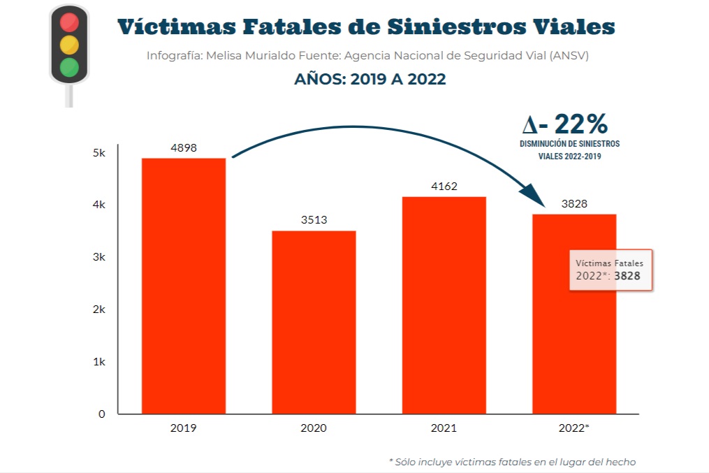 Como se mencionó, de acuerdo a cifras oficiales de la ANSV, en 2022 3.828 personas fallecieron en el acto por accidentes viales, a pesar de que las cifras son preliminares y aún resta el informe sobre las fallecidas 30 días posteriores al hecho; la misma implica una disminución del 22% de la mortalidad con respecto al período anterior a la pandemia (2019).