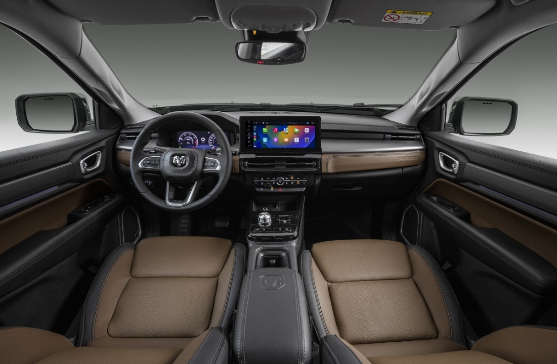El panel de instrumentos está tapizado en cuero, al igual que el panel de la puerta, el apoyabrazos central y el volante multifunción con regulación en altura y profundidad. El panel de instrumentos está tapizado en cuero negro en la versión Rebel, cuero marrón en lal Laramie y gamuza en la R/T. Además de esto, el panel de la puerta delantera y la parte superior del tablero de instrumentos son soft touch, lo que ayuda a reducir el ruido interno en la cabina. En todas las versiones, el asiento del conductor es eléctrico con 12 posiciones, 4 de las cuales son lumbares. El asiento del pasajero es eléctrico de 12 posiciones en R/T (opcional en otras versiones).