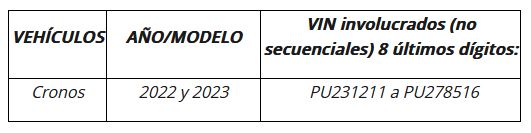FCA Automobiles Argentina, una empresa del grupo Stellantis, convoca a aquellos propietarios de Fiat modelo Cronos, año modelo 2022 y 2023 para que, a partir del día 10 de julio de 2023, agenden un turno en una de las concesionarias de la red Fiat a fin de que sea realizada gratuitamente, la sustitución de los cinturones de seguridad del asiento trasero de los vehículos convocados, como se indica abajo: