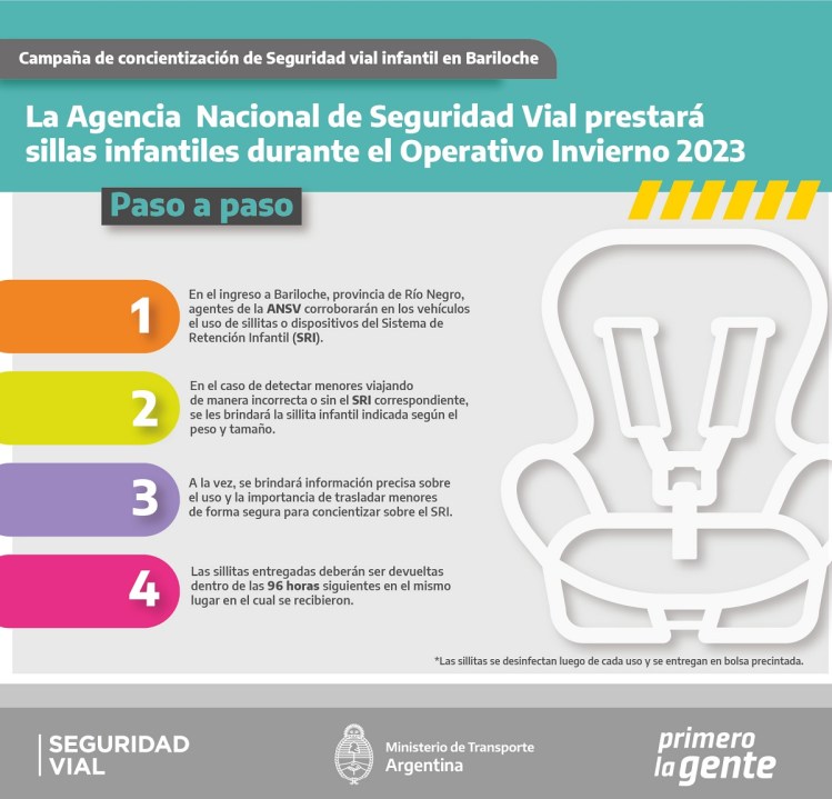 La Agencia Nacional de Seguridad Vial entregará sillas infantiles en préstamo durante las vacaciones de invierno. Será en los controles que realizará el organismo en Bariloche y forma parte de una campaña de concientización acerca de la importancia de que los más chicos viajen seguros y de manera adecuada